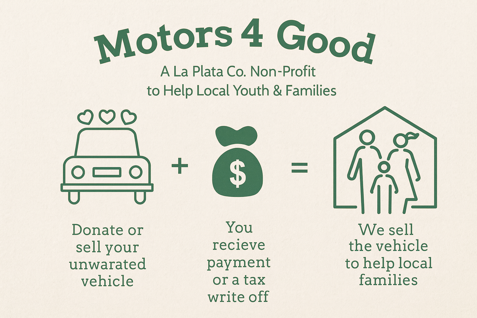 In most cases, your vehicle will be prepared for sale at auction so that the proceeds are available to provide scholarships and support services to families and youth in need. In some cases if a vehicle can be made available to a family in need or go to a supporting organization to further their work with families and youth, we will put it to that use. All of the support services we provide stay in the state of Colorado and more often than not, remain in La Plata, Montezuma, and Archuleta Counties. For a list of organizations we support, please contact us.